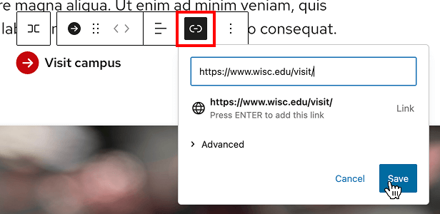 Using the Block Inserter, search for UW Link and add it to your page. You can also type /uw link in a new paragraph block and press Enter.