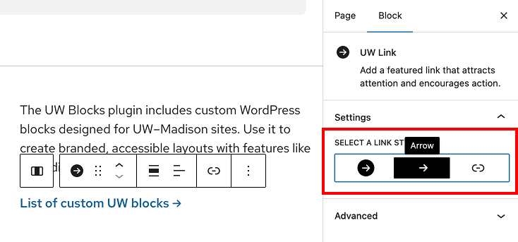You can change arrow styles in the UW Link block settings panel. This panel opens in the right sidebar when the block is selected.