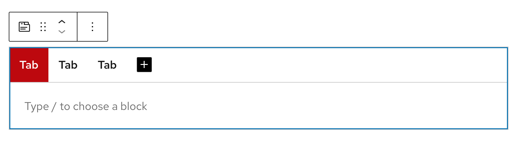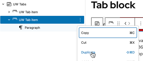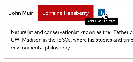 Using the Block Inserter (+ icon), search for UW Tabs and select it. You can also type /uw tabs in a new paragraph block and press Enter to add it quickly. The block starts with three tab items by default.