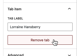 Select the tab, then click the red Remove tab button in the block settings panel, or select Delete from the three-dot menu in the List View.