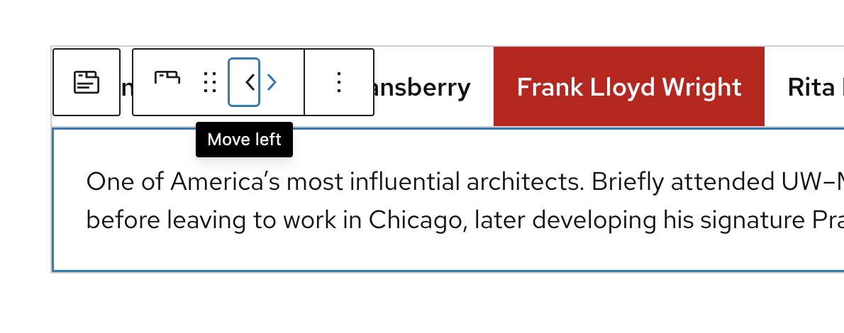 Open the List View to drag and drop tabs to reorder them, or use the left/right arrows in the UW Tabs block toolbar.