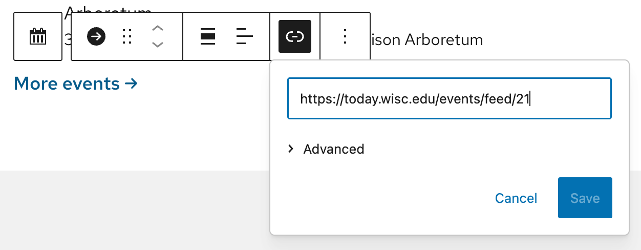 The More events link uses the UW Link block. By default, it points to the feed URL on today.wisc.edu. To add your own custom URL, select the block and click the Link icon to enter your link.