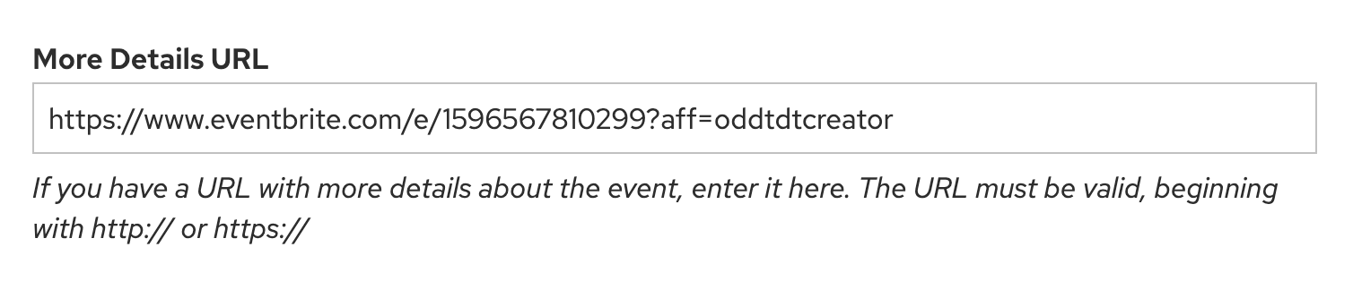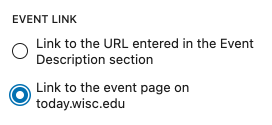 By default, events link to the More Details URL entered in today.wisc.edu for your event (found in the Event Description section). If no URL is entered, they link to the event’s detail page on today.wisc.edu.