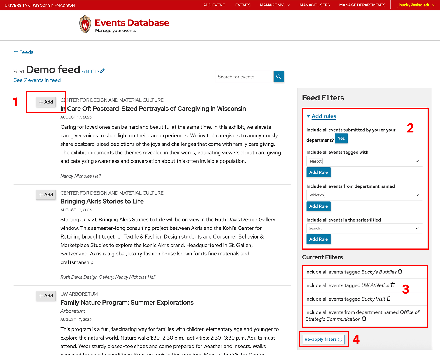 2. Add filter rules for tags, departments, or event titles to include in your feed in the Feed Filters sidebar on the right. Click Add Rule for each tag you want to apply.