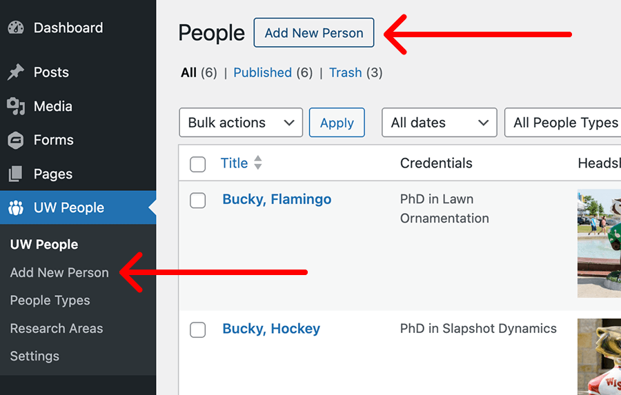 1. Go to WordPress Admin > UW People > Click on the Add New Person button in the top left.