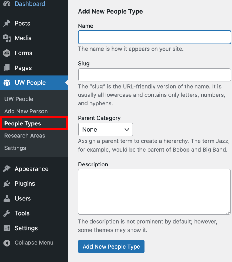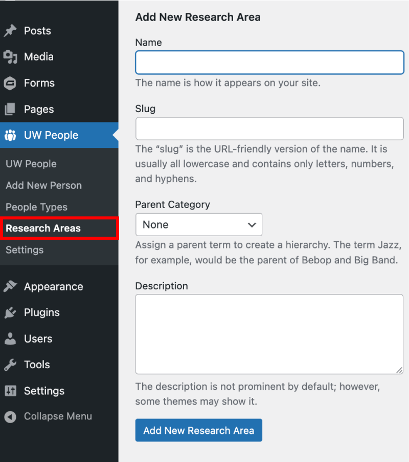 Go to WordPress Admin > UW People > People Types or UW People > Research Areas to create tags for each category.