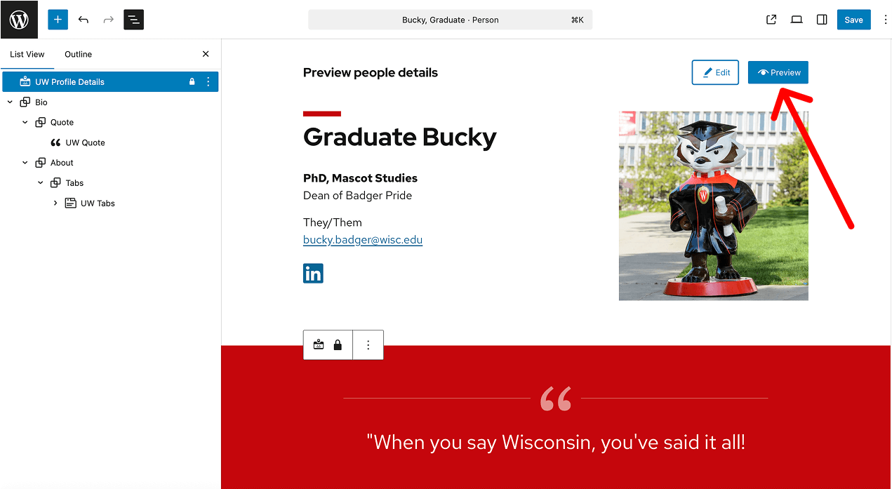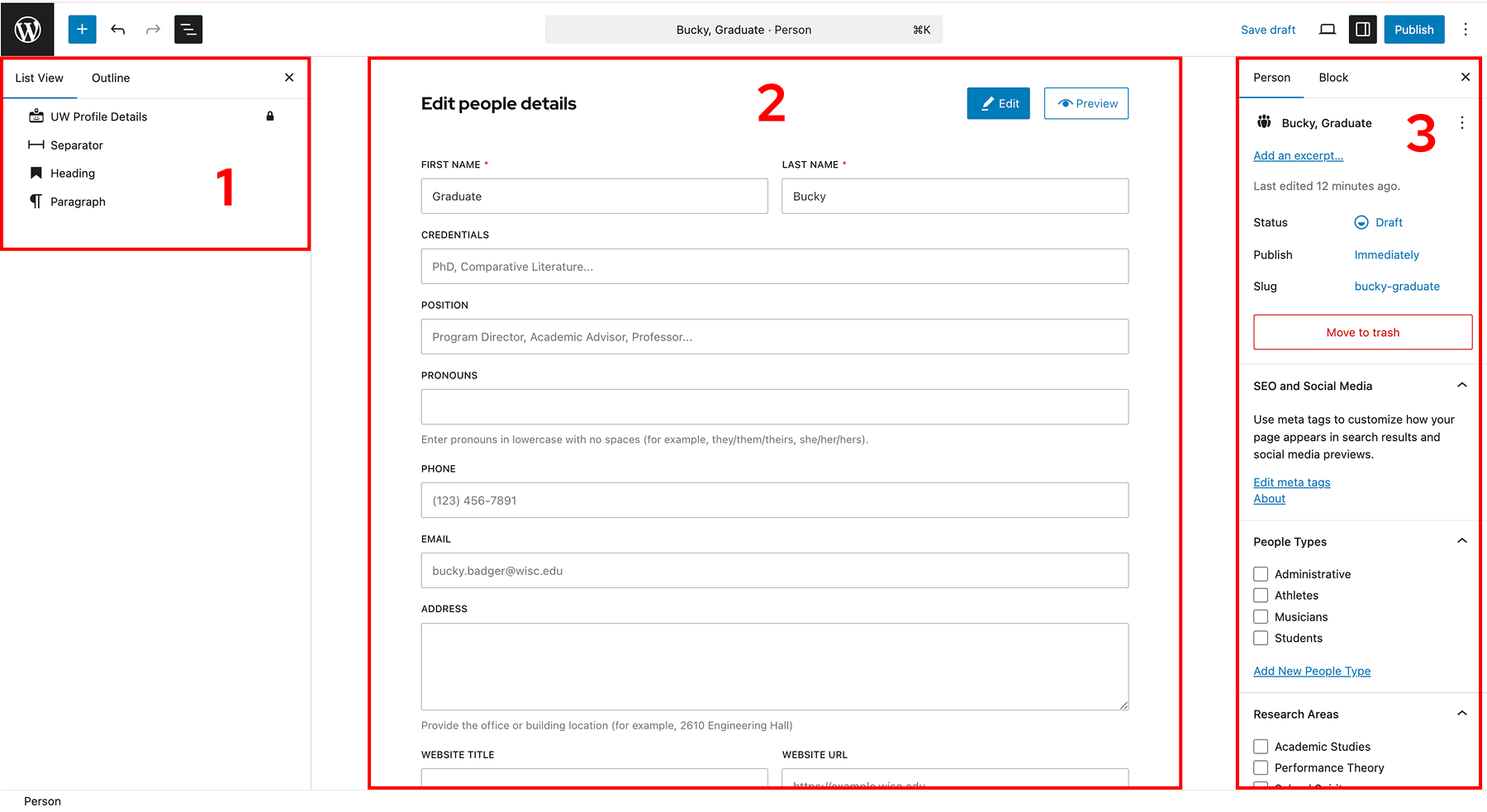 Do not remove the UW Profile Details block (lock icon). It stores structured data that powers the UW People Listing block. If deleted, the fields are lost and the page must be recreated.