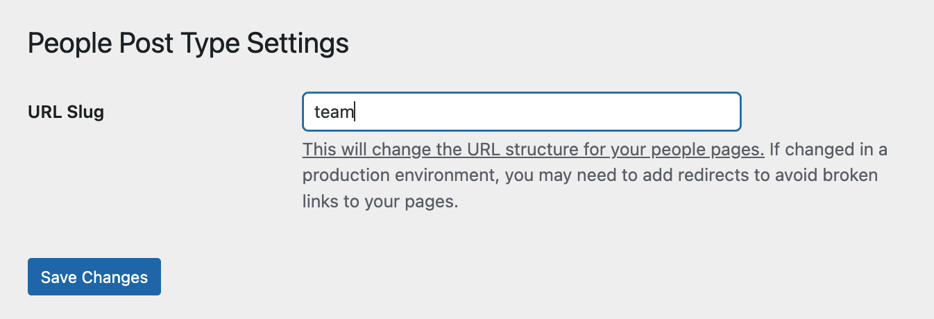 Note: If you change this after creating people pages, you may need to set up redirects to avoid broken links. If your site is hosted in WiscWeb, you can use the Redirection plugin.