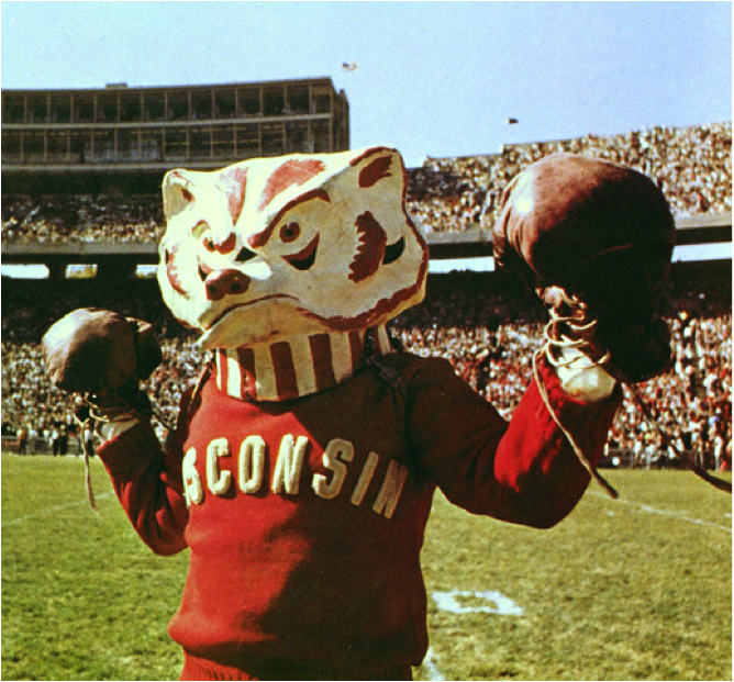 The familiar strutting badger in a striped sweater was first drawn in 1940 by artist Art Evans for Brown’s Book Store. In 1949, Bucky came to life when student Carolyn Conrard designed a papier-mâché head, worn by cheerleader Bill Sagal at Homecoming. Since then, Bucky has become a symbol of Wisconsin pride, evolving through trademark battles and design updates—most recently in 2003—and earning a spot in the Mascot Hall of Fame in 2006.